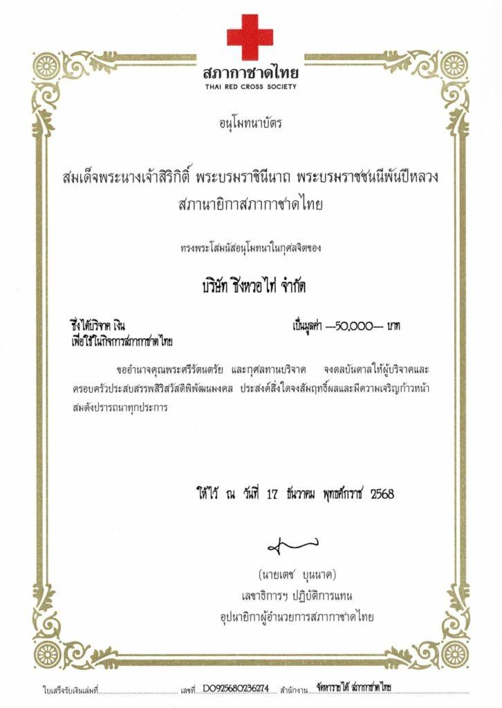 In addition, Zing Whor Thai Co., Ltd. donated 50,000 THB to support the relief operations of the Thai Red Cross Society. The donation was officially acknowledged with a donation certificate dated 17 December 2025.